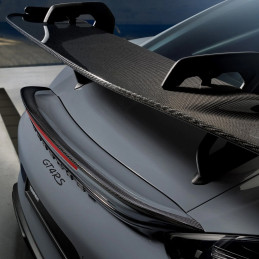 Le kit Manthey du 718 Cayman GT4 RS peut être complété par un aileron arrière en carbone spécialement conçu. Ce dernier, en carbone visible, est fixé sur le bord arraché de série, par ajustement, en complément de l'aileron arrière fixe. L'appui aérodynamique important de l'aileron arrière augmente de 4 % l'appui sur l'essieu arrière.