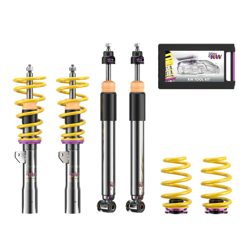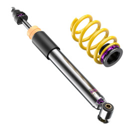 Un dessin et un langage des formes intemporels, associés à une sportivité authentique. Des amortisseurs KW V3 à réglage indépendant des compressions et extensions sont disponibles comme kit complet de suspension dans des corps en acier galvanisé. Avec ces amortisseurs, il est possible de régler le comportement du véhicule selon vos propres exigences de conduite, sans modifications importantes du classique, sans démontage des ressorts à torsion d'origine ni de transformations longues des jambes de force avec cartouches d'échange. Grâce aux molettes de réglage intégrées pour compression et détente, il est facile d’adapter le setup de base recommandé à votre véhicule. Par exemple, l’amortissement en détente réglable sur 16 clics vous permet d’influer directement sur les caractéristiques de maniabilité et sur le confort de conduite. Avec la valve de compression Lowspeed réglable indépendamment en douze clics, vous pouvez, si vous le souhaitez, modifier davantage le comportement du classique Porsche. Une pression de compression plus élevée à l’avant procure une direction encore plus directe, tandis qu’à l’arrière, des forces de compression plus élevées contrent le survirage. Lors d’un affaissement brutal, comme lors du franchissement de dos d’âne, l’amortissement haute vitesse préconfiguré permet un affaissement rapide et empêche le rebond. Un Porsche 911 classique équipé des amortisseurs réglables KW offre, par rapport au train d’origine, une maniabilité beaucoup plus directe. Sur l’essieu moteur, l’adhérence des pneus augmente nettement, sans que la tendance au survirage précoce n’augmente. Les amortisseurs KW procurent une sensation de conduite bien plus sûre et le survirage typique est nettement neutralisé. De plus, il est possible de conserver les ressorts à torsion d’origine sur les essieux avant et arrière. Lors de l’achat et du montage chez un partenaire spécialisé KW, les partenaires certifiés offrent la garantie complémentaire éprouvée KW de 5 ans sur le jeu d’amortisseurs KW. Le remplacement des amortisseurs d’origine par les amortisseurs réglables KW n’exige pas d’homologation dans les papiers du véhicule.