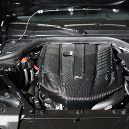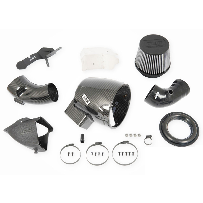 En remplacement du tuyauterie d'admission d'air d'origine, nous avons conçu un tube en carbone plus grand et plus lisse. Il commence avec un diamètre de 105mm (4,1 pouces) et se réduit de manière transparente pour s'adapter à la tuyauterie d'entrée de turbo. Fixé au tube d'admission se trouve notre grand filtre à air conçu sur mesure. Le filtre a une gaze de coton densément tricotée pour une filtration supérieure. Il est bien sûr lavable et réutilisable pour des performances optimales et une longue durée de vie.